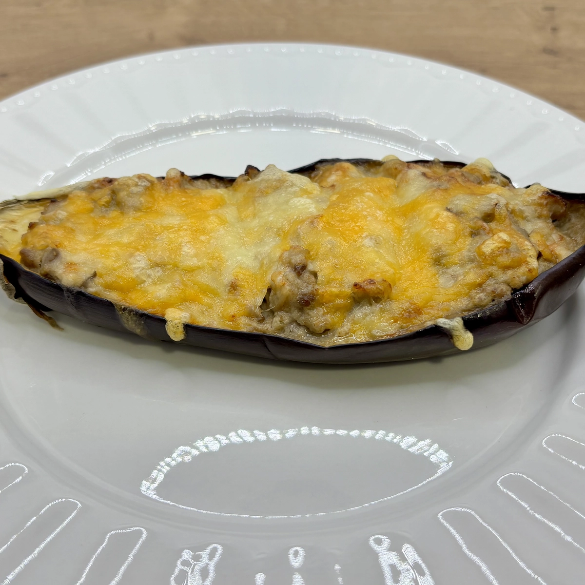 Berenjena rellena de carne picada, con bechamel y gratinada con